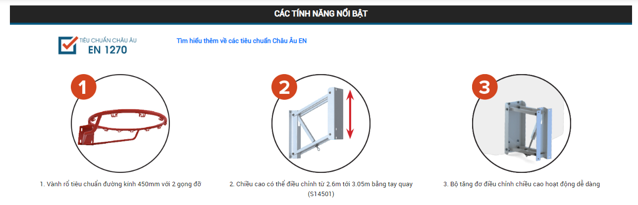 | Chiều cao vành rổ | Điều chỉnh từ 2.60m tới 3.05m |