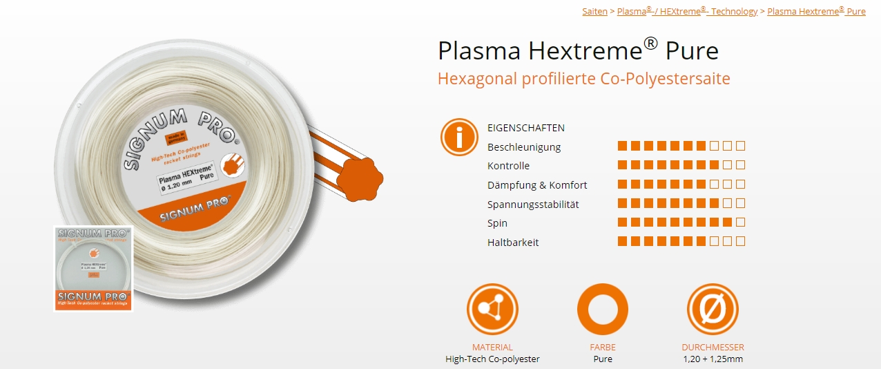 - Sợi dây Signum Pro Plasma HEXtreme Pure là một co-polyester có cấu tạo hình lục giác giúp bóng bám chặt hơn và dễ spin hơn. Với phản hồi được cung cấp lực thấp, HEXtreme Pure sẽ giúp bạn tấn công bóng mà không phải lo lắng về việc đánh quá mức. Một lựa chọn tuyệt vời cho những người chơi Khá và Tốt, những người muốn kiểm soát nhiều hơn và độ xoáy lớn hơn trên những cú đánh swing của họ.