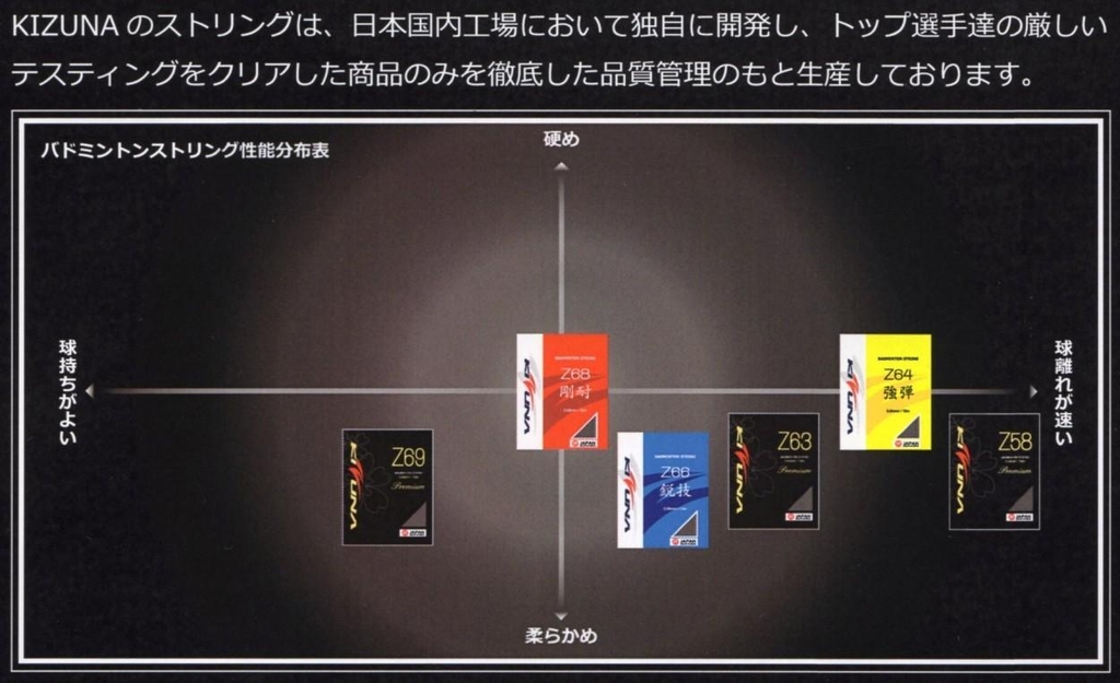 - Dây cầu lông KIZUNA Japan Z69 cao cấp là loại dây thuộc loại siêu bền với tiết diện 0.69mm. Đây là dòng dây thiên về kiểm soát cho những cú đạp mềm mại dễ điều khiển. (focus on durability)