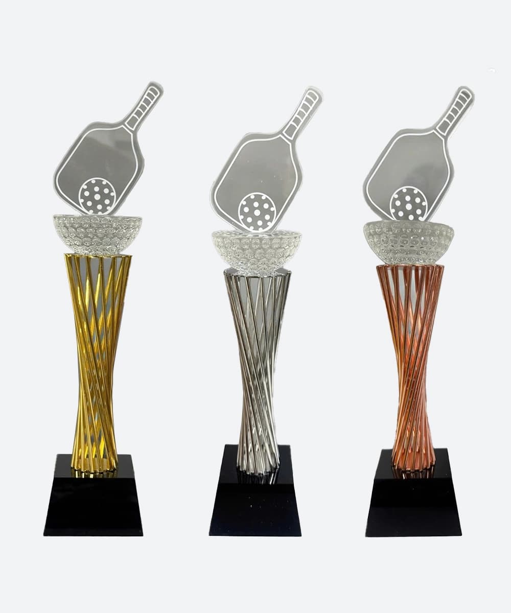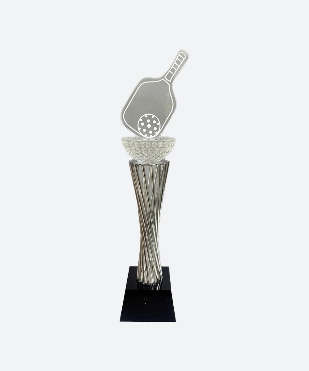 Điểm nhấn của chiếc cúp nằm ở thiết kế độc đáo, với phần thân được khắc họa chi tiết hình ảnh vợt và bóng Pickleball một cách tỉ mỉ. Mỗi đường nét đều thể hiện sự uyển chuyển, mạnh mẽ của môn thể thao này, biến chiếc cúp thành một biểu tượng đích thực, không thể nhầm lẫn.