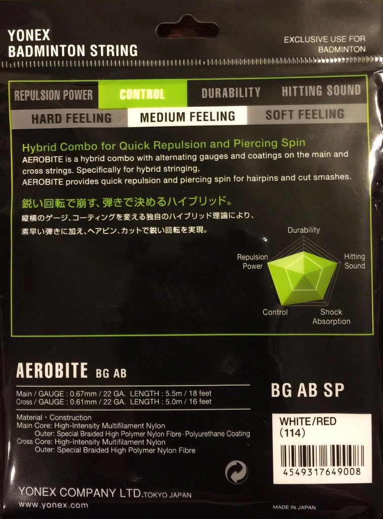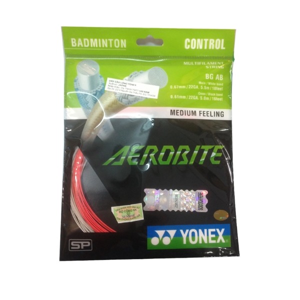 - Cước căng vợt Yonex BG Aerobite là loại dây cao cấp đến từ nhà Yonex được cấu tạo từ hai sợi riêng biệt khác nhau, dây dọc có đường kính 0.67 mm dài 5.5m, đường kính dây ngang nhỏ hơn với 0.61 mm dài 5m. Với lõi dây được cấu tạo từ đa sợi tơ Polymer Nylon độ ma sát cao, phần vỏ làm từ sợi bện đặc biệt Polymer Nylon thô độ bền cao. Ngoài ra dây dọc còn được phủ thêm lớp Polyeurethan cung cấp thêm sự cứng cáp, bền bỉ cho dây.
