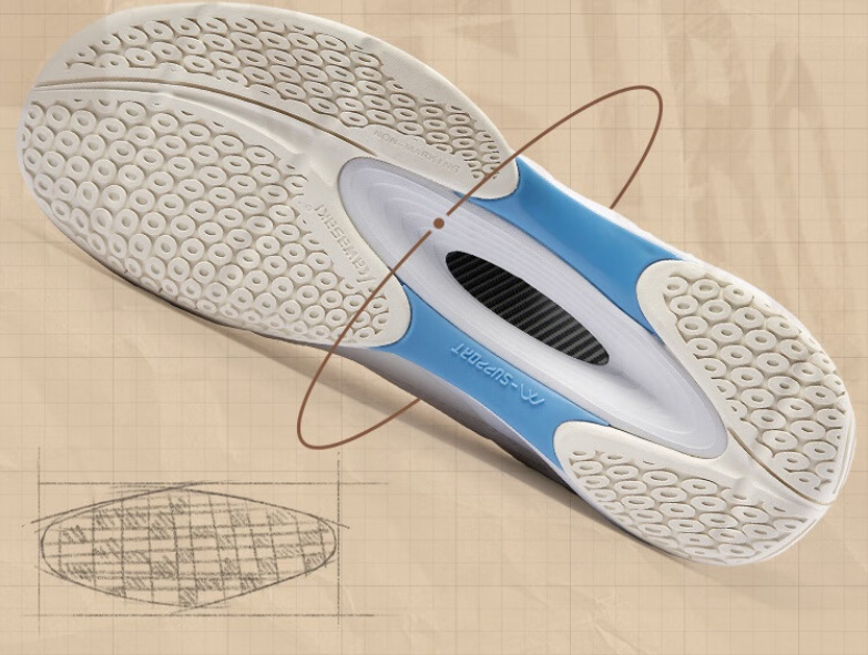 - Thiết kế đế mới chống xoắn bằng các tấm sợ carbon ở phần đế ngoài kết hợp với TPU chống xoắn, giúp ôm sát cổ chân, cải thiện khả năng chống lật cổ chân.