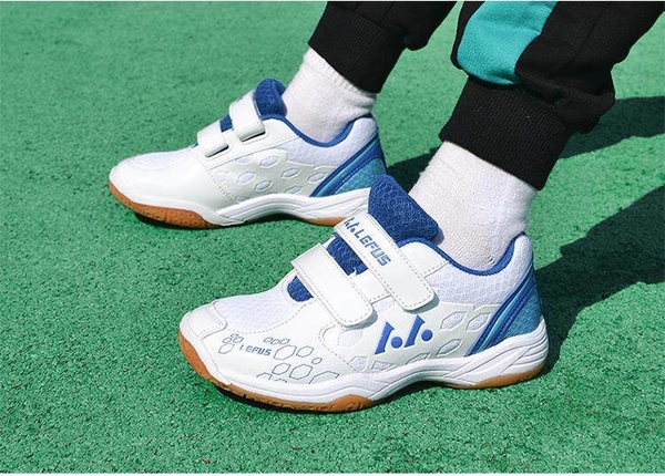 - - Giày cầu lông trẻ em Lefus 1086 Màu Trắng xanh có thiết kế đồng nhất từ phần thân giày, đế giày, cho đến mũi giày. Đây là đôi giày bảo vệ tối ưu cho trẻ em trong quá trình tập luyện và thi đấu