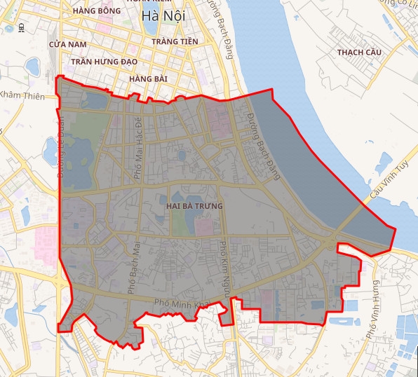 Quận Hai Bà Trưng có phía Bắc giáp quận Hoàn Kiếm (từ phố Nguyễn Du-Lê Văn Hưu-Hàn Thuyên kéo dài đến đầu phố Trần Hưng Đạo-dốc Vạn Kiếp); phía Đông giáp sông Hồng (từ đoạn dốc Vạn Kiếp đến phường Thanh Trì (quận Hoàng Mai); phía Tây giáp quận Đống Đa và Thanh Xuân (theo trục đường Lê Duẩn-Giải Phóng); phía Nam giáp huyện Thanh Trì.Quận Hai Bà Trưng hiện có 20 phường: Nguyễn Du, Lê Đại Hành, Bùi Thị Xuân, Phố Huế, Ngô Thì Nhậm, Phạm Đình Hổ, Đồng Nhân, Đống Mác, Bạch Đằng, Thanh Lương, Thanh Nhàn, Cầu Dền, Bách Khoa, Quỳnh Lôi, Bạch Mai, Quỳnh Mai, Vĩnh Tuy, Minh Khai, Trương Định, Đồng Tâm