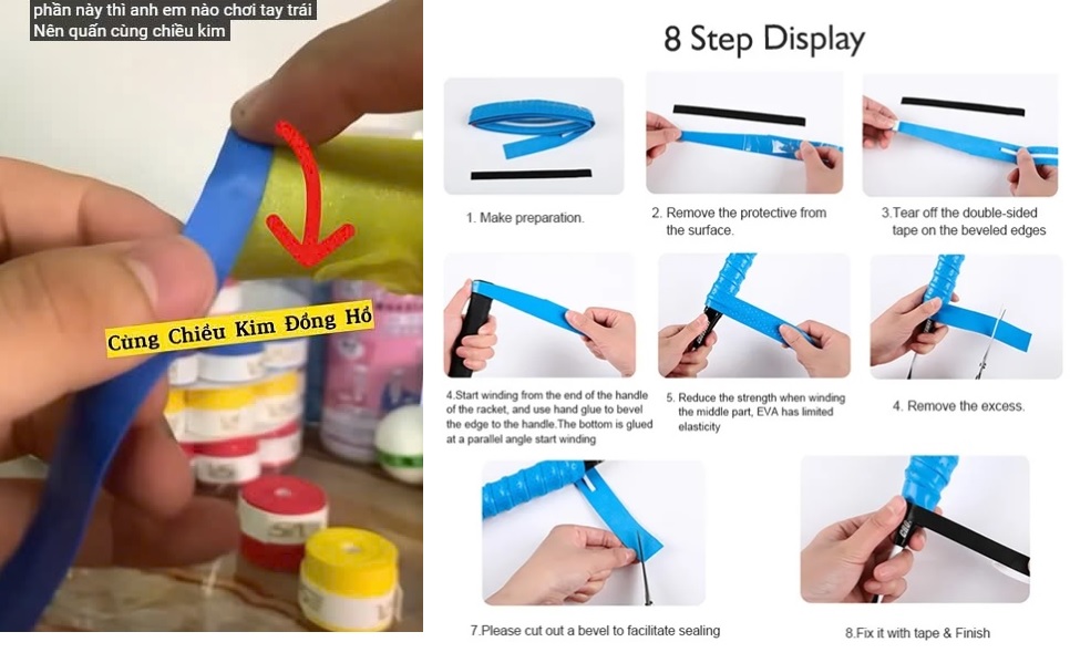 - - Với người tay thuận (thuận tay phải) thì mọi người cuốn cán theo cốt vợt có sẵn (nhìn từ đít vợt thì là ngược chiều kim đồng hồ)