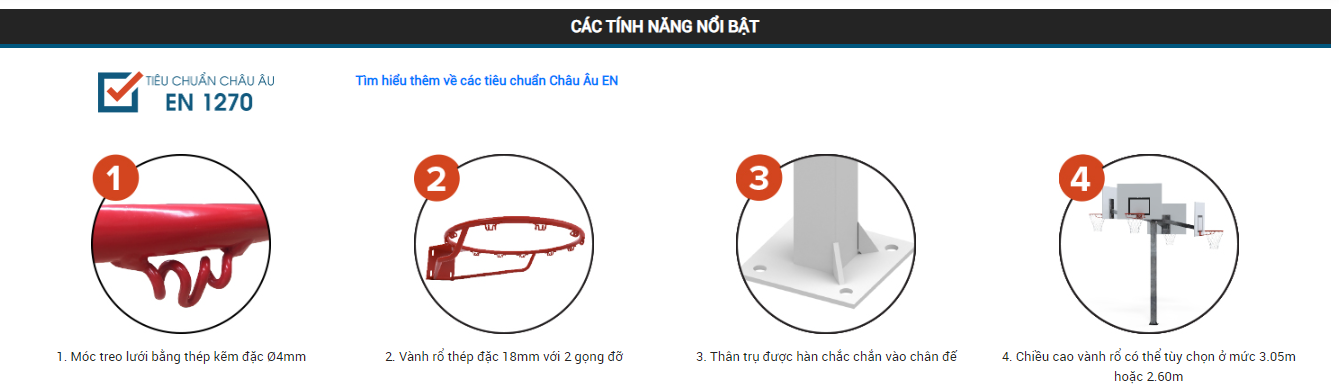 - Chiều cao vành rổ: Tùy ý khi lắp đặt ở các mức 2.60m hoặc 3.05m