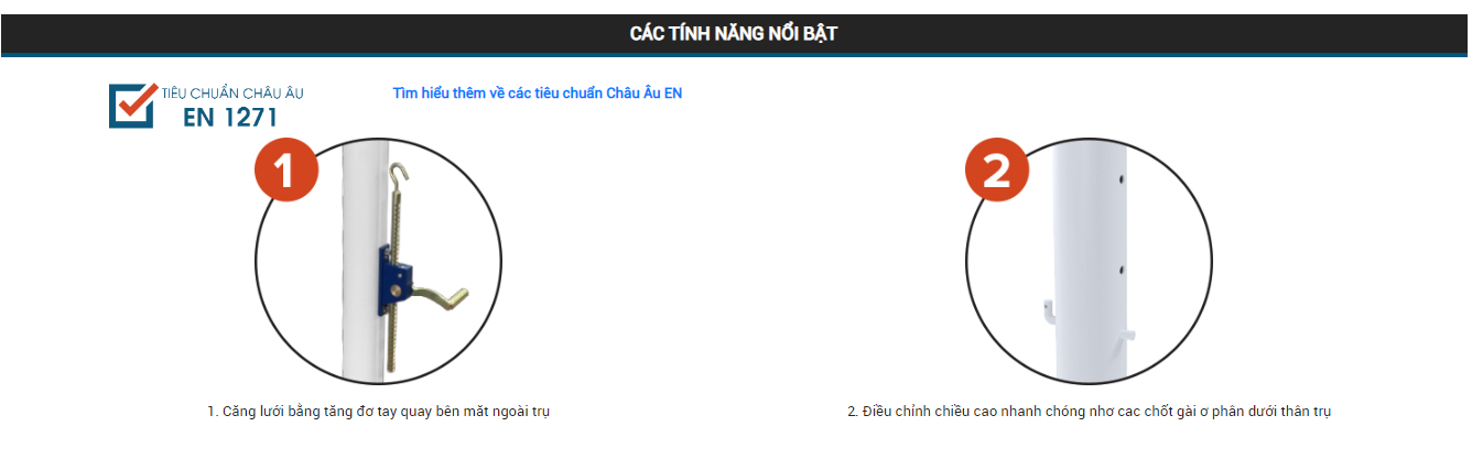 Chiều cao lưới có thể điều chỉnh ở các mức từ: 2.12m - 2.45m bằng các chốt chặn trên thân trụ. Căng lưới bằng tăng đơ tay quay