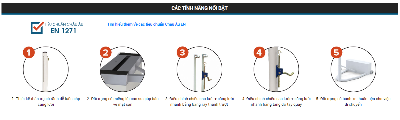- Chiều cao của lưới có thể điều chỉnh bằng băng ray có thanh trượt, căng lưới bằng tăng đơ