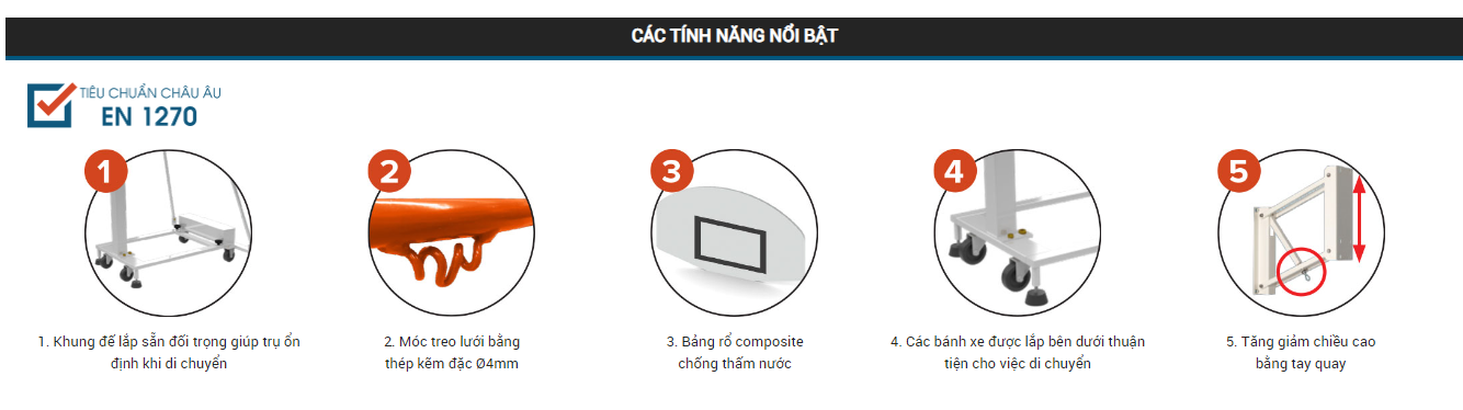 | Chiều cao vành rổ | Điều chỉnh từ 2.60m tới 3.05m |