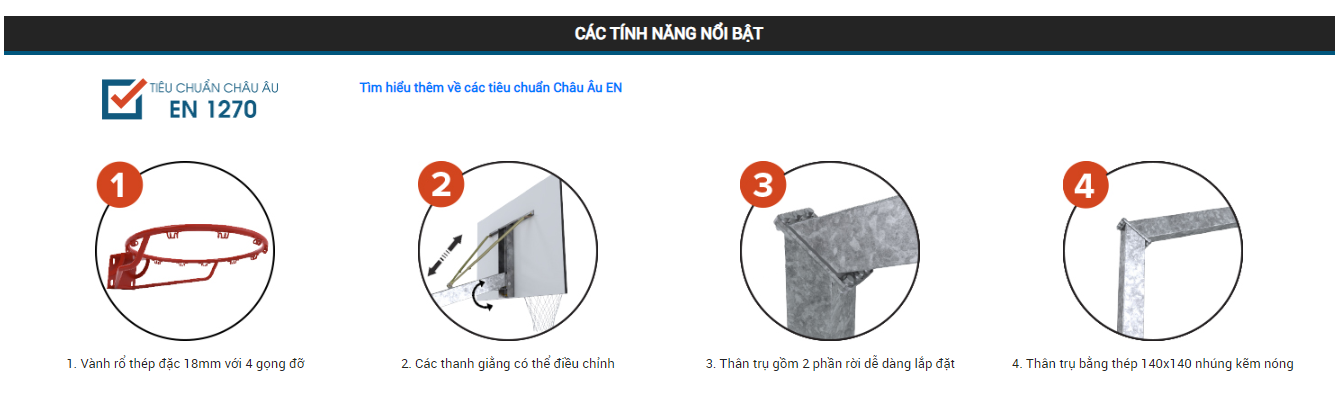 - Tầm vươn 2.25m, chiều cao vành rổ cố định 3.05m