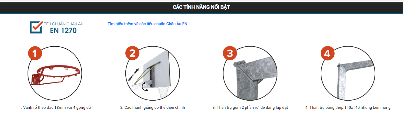 - Tầm vươn 2.25m, chiều cao vành rổ cố định 3.05m