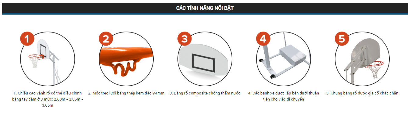 | Chiều cao vành rổ | Điều chỉnh từ 2.60m tới 3.05m |
