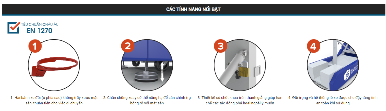Trụ bóng rổ di động xếp bằng thép vuông 140x140mm. Chiều cao vành rổ 3.05m, tầm vươn 1.2m