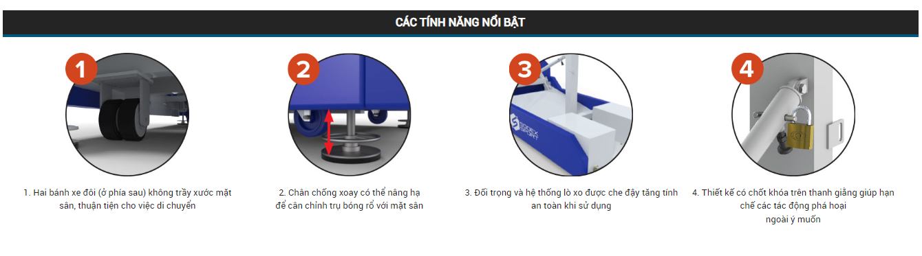 | Chiều cao vành rổ | Điều chỉnh 2.60m hoặc 3.05m |