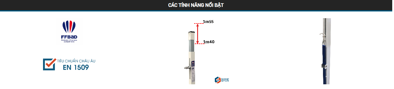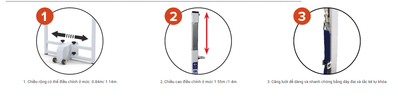 Chiều cao có thể điều chỉnh từ 1.40m tới 1.55m. Căng lưới bằng dây đai và khóa tự động