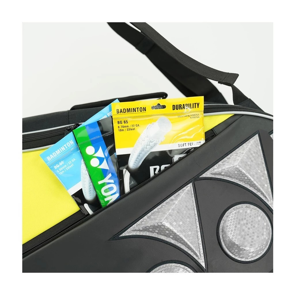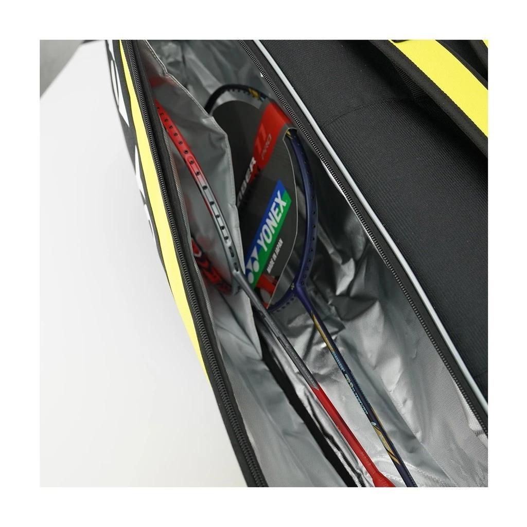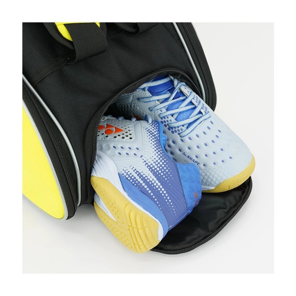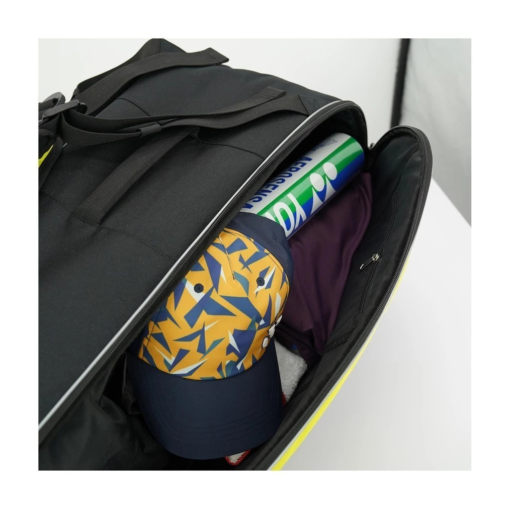 - Hai ngăn lớn siêu bự, 1 ngăn có lót bạc dùng để đựng vợt, một ngăn đựng các vật dụng như ống cầu, khăn lau, quần áo,...