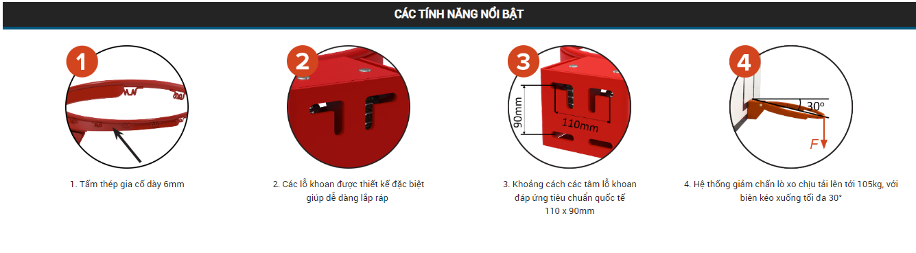 Đường kính vành rổ: 450mm, hệ thống lò xo đôi chịu tải lực lên tới 105kg, phù hợp cho thi đấu