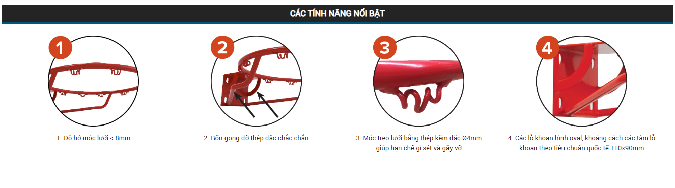 Vành rổ bằng thép đặc Ø18mm, 4 gọng đỡ, sơn tĩnh điện cam. Đường kính vành rổ: 450mm