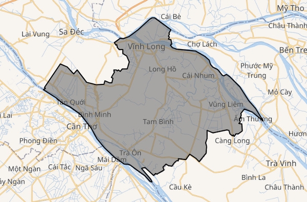 Tỉnh Vĩnh Long có 8 đơn vị hành chính cấp huyện, gồm 1 thành phố (Tp. Vĩnh Long), 1 thị xã (TX. Bình Minh) và 6 huyện (Bình Tân, Long Hồ, Mang Thít, Tam Bình, Trà Ôn, Vũng Liêm).