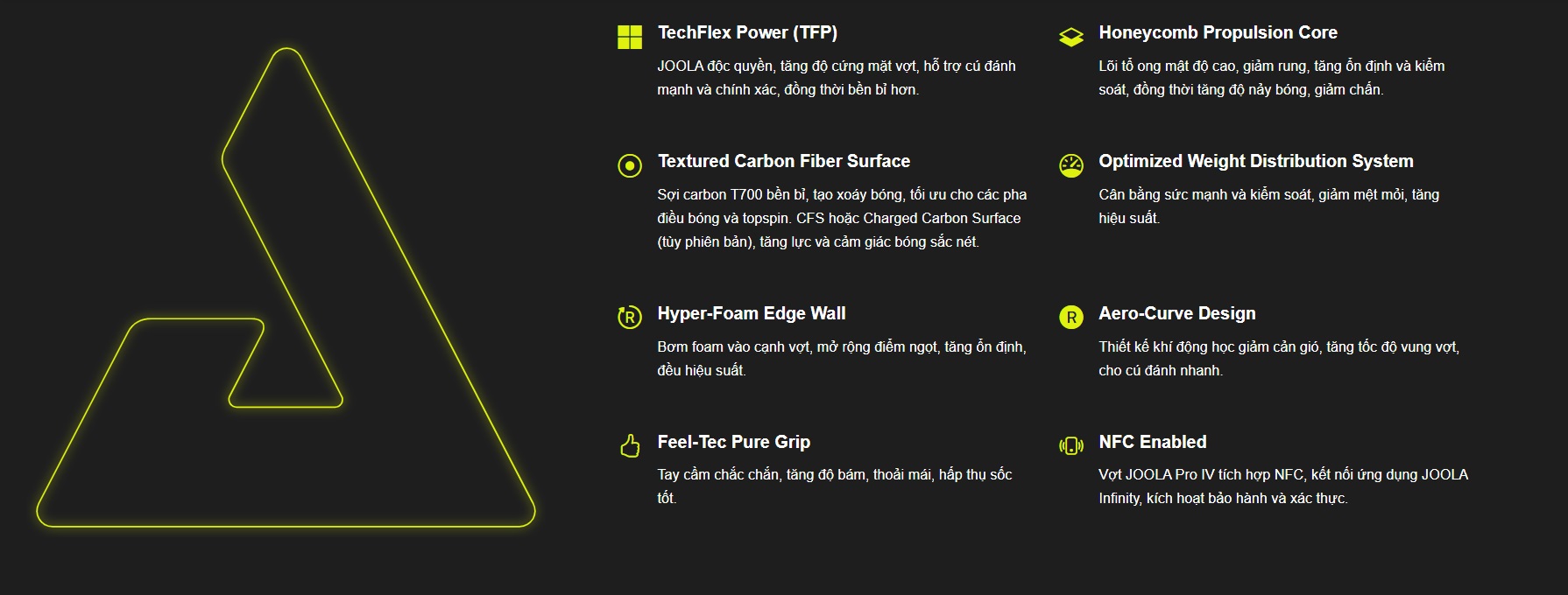Vợt Joola Hyperion Pro IV không chỉ là một bản cập nhật về thiết kế. Sức mạnh thực sự của nó nằm ở những công nghệ tiên tiến được tích hợp bên trong.